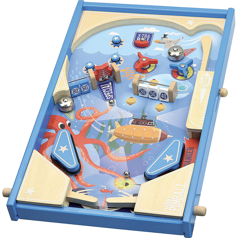 Divertiti con gli amici con il flipper Pinball sotto il mare! Realizzato in legno, include 3 palline di metallo per colpire i bersagli, attivare le campane e rimuovere i tornelli. Rimuovi i piedini in legno per una maggiore sfida. Adatto ai bambini dai 5 anni in su.
